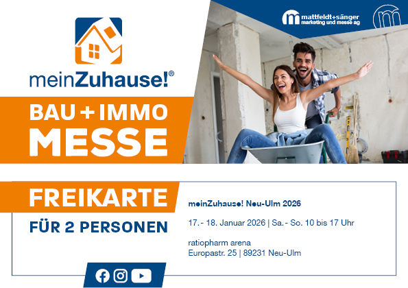 Besuchen Sie uns vom 17. - 18. Januar 2026 auf der Bau- und Immomesse in Neu-Ulm oder bei den Augsburger Immobilientagen vom 30. Januar 2026 bis 1. Februar 2026.